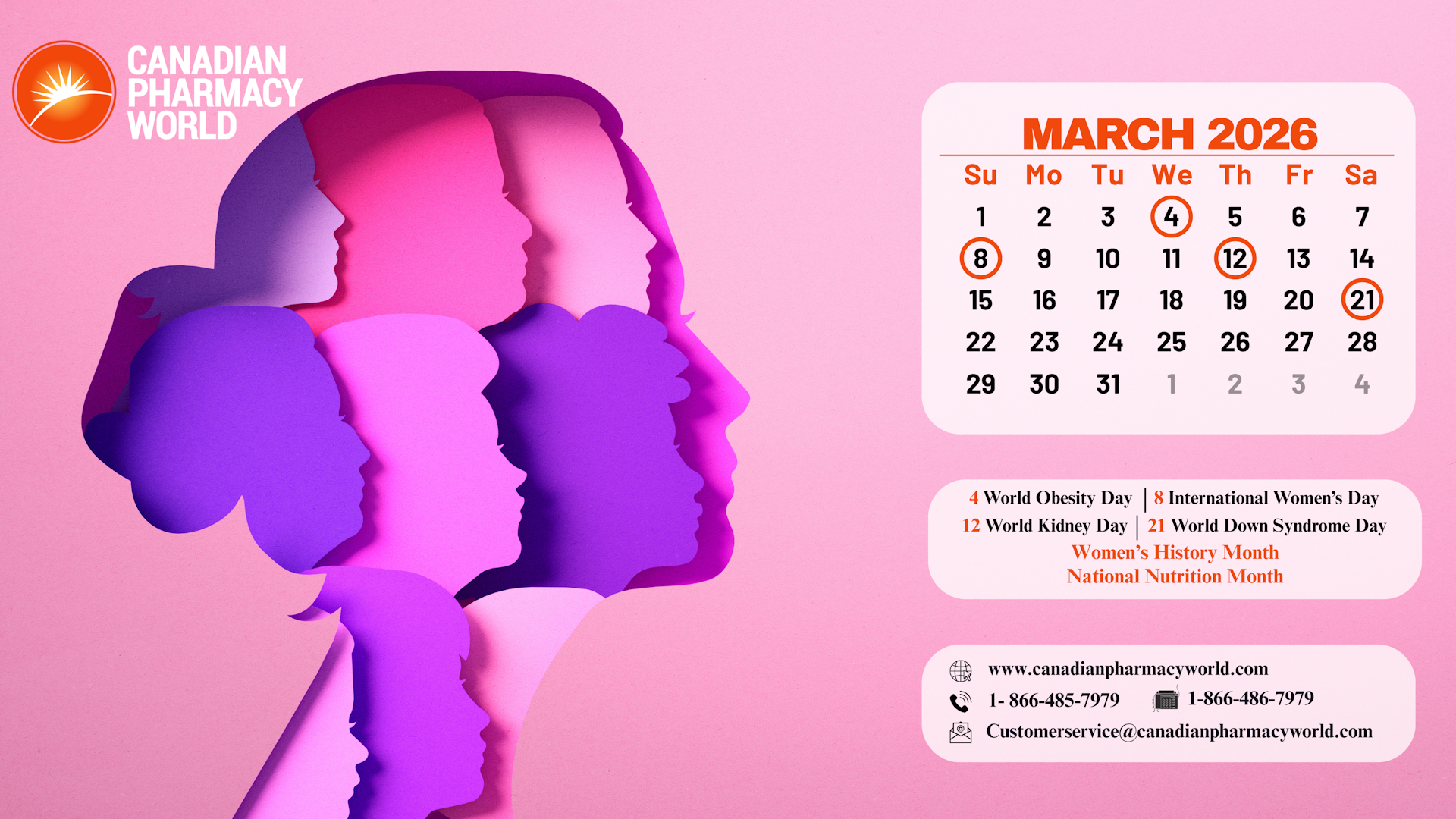 March has arrived, bringing the energy and freshness of spring! At Canadian Pharmacy World , we’re honoring Women’s History Month & highlighting women’s wellness, while also recognizing World Kidney Day and celebrating St. Patrick’s Day. Download our March calendar & join us in empowering women everywhere!